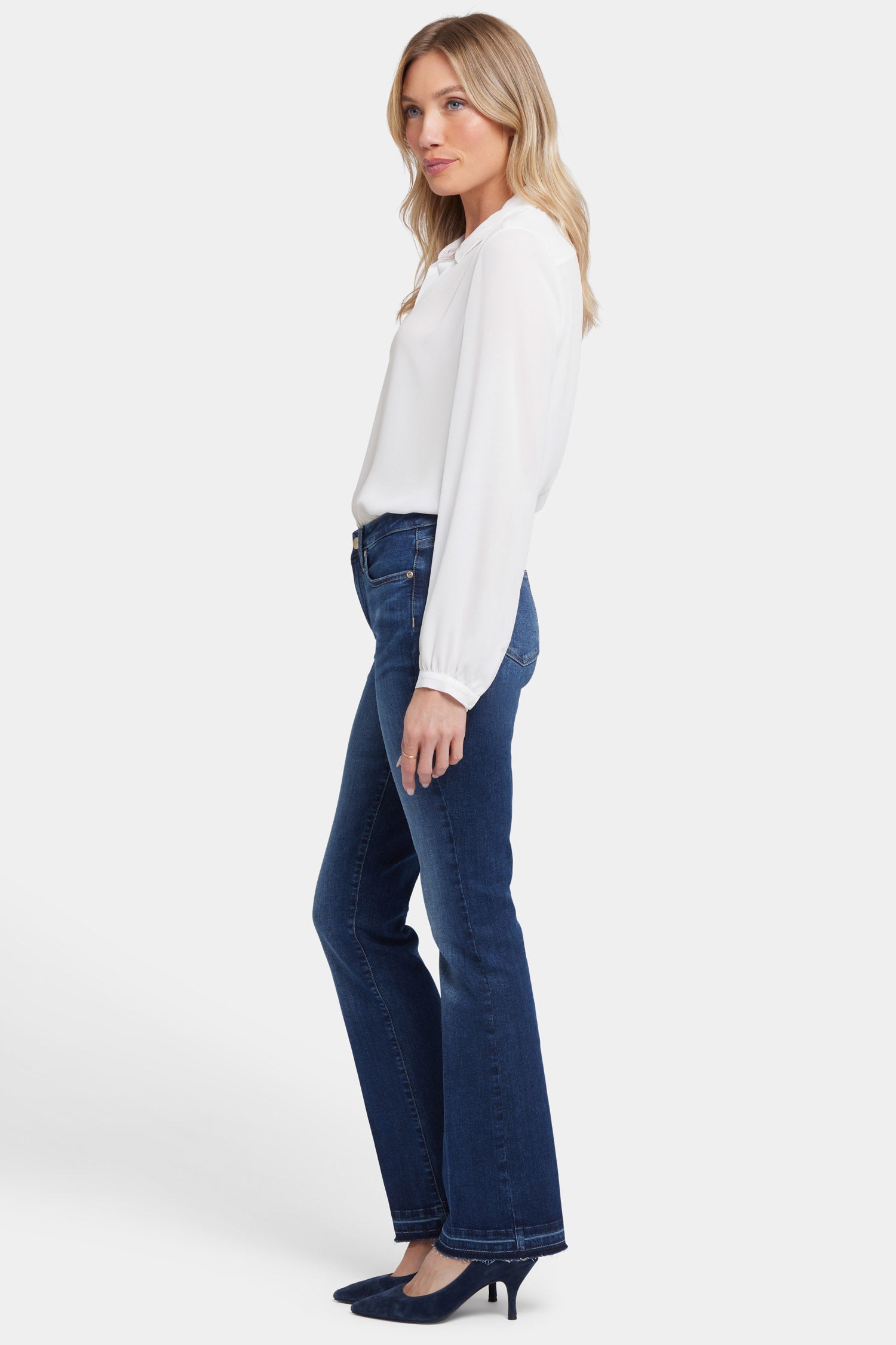 Smoothing and sculpting with flattering flare to boot, NYDJ's Barbara Bootcut Jeans with Leg Creases and Released Hems fit just right. Our exclusive Lift Tuck® Technology uses a proprietary slimming panel with a patented criss-cross design to flatten in front and boost curves in back. The traditional bootcut fit creates a body-hugging, legs-for-days look. Finished with classic five-pocket styling, zip fly, button closure, front and back pressed leg creases and released hems with crease detail. Vantage is a dark blue wash with whiskering on the front hips and sanding on the front thighs, knees and seat. This jean is made with earth-friendly methods that result in reduced consumption of water, chemicals and/or energy.